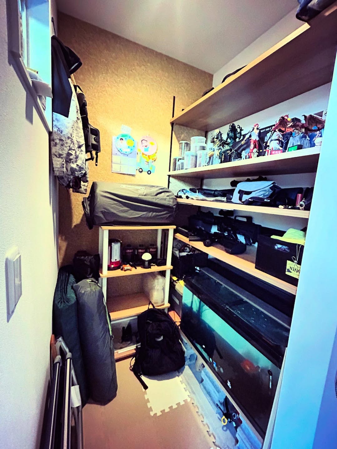 「魚、エアガン、フィギュア、昆虫、キャンプ道具など、好きなものが詰まったスペースです!」という多趣味なご主人自慢の趣味空間。物をスッキリ収納できるよう設置した大きな可動棚も、大活躍しています。