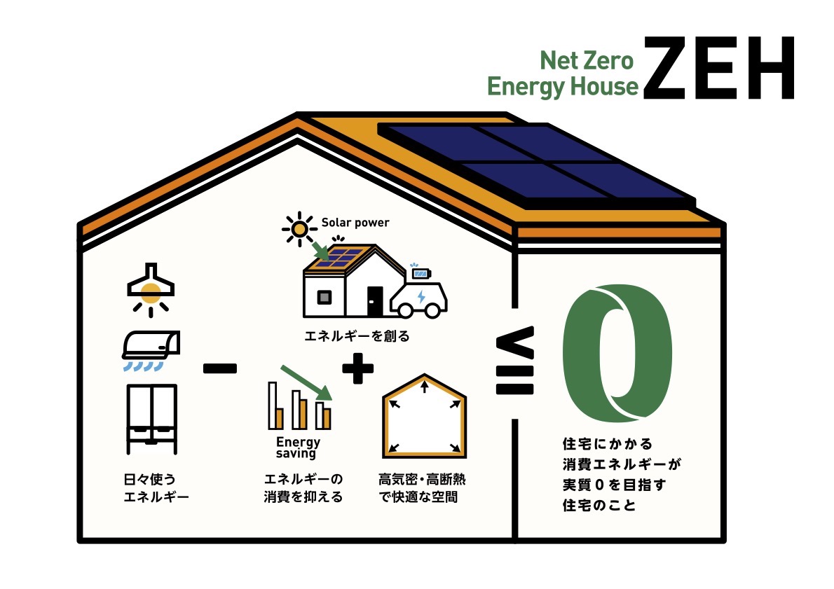 ZEHとは、「ネット・ゼロ・エネルギー・ハウス」の略で、創エネによって自家消費エネルギー収支を正味ゼロにする省エネ住宅です。