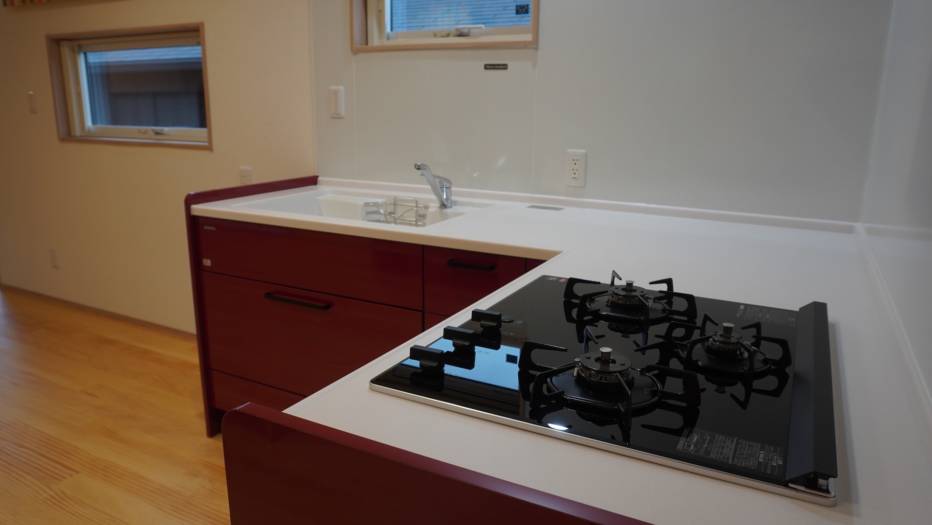 シンク、作業スペース、コンロを壁に沿ってL字型に配置したキッチン。