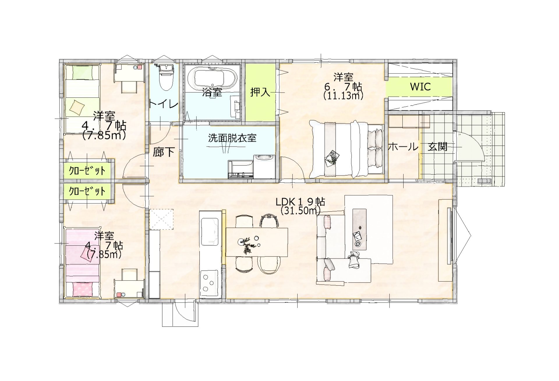 間取りは、LDKを中心に各居室をL字に配置した無駄のない設計です。廊下が少ない分、収納や洗面脱衣室はゆったりとした広さを確保しました。