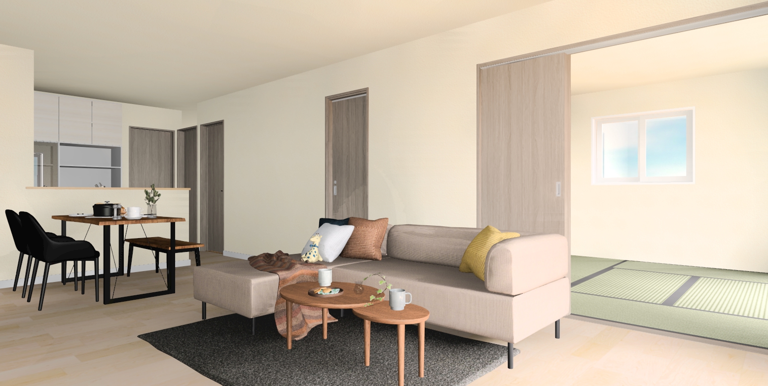 住まいの中心は、開放感にあふれた19.2帖のLDK。リビングに隣接した和室と広いアウトドアテラスが、一層広々とした大空間を生み出します。