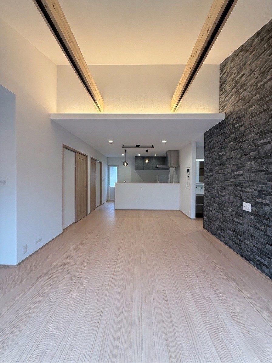 開放的な吹き抜けリビングは、間接照明の柔らかな明かりが上質で落ち着いた雰囲気を演出します。