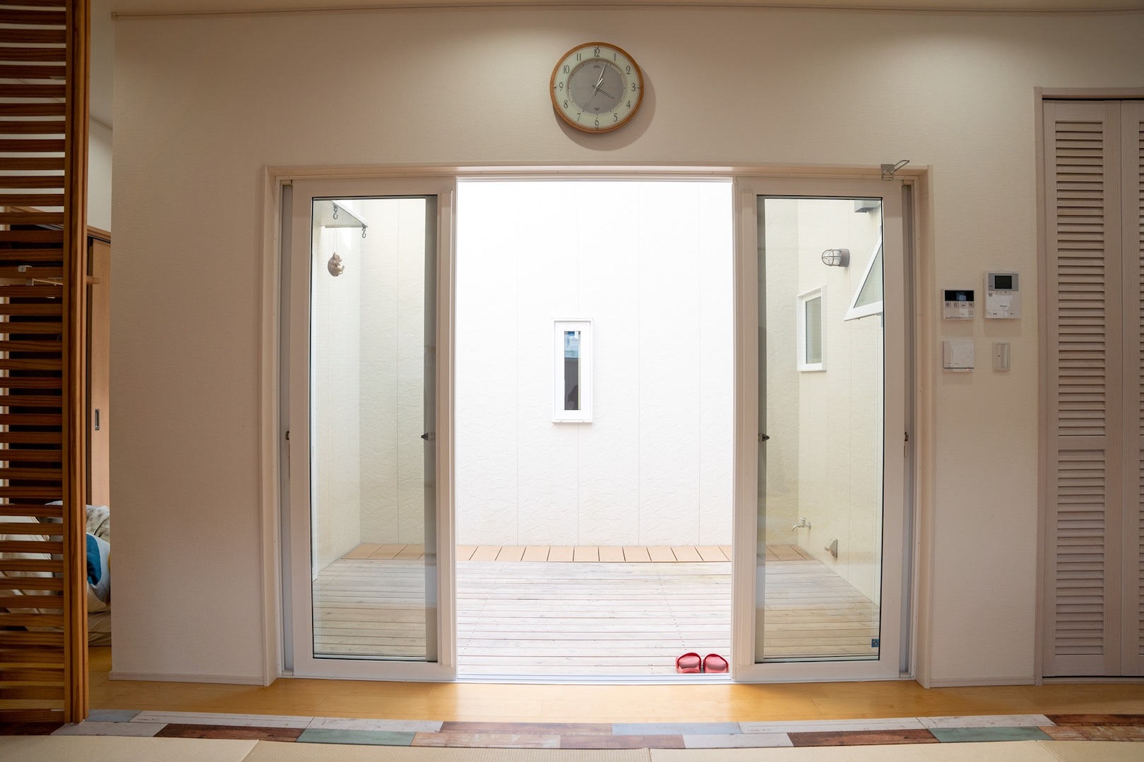 中庭やテラスを囲むような間取りにすれば、お部屋の奥まで光が届き、室内全体が明るく開放的な印象になります。
