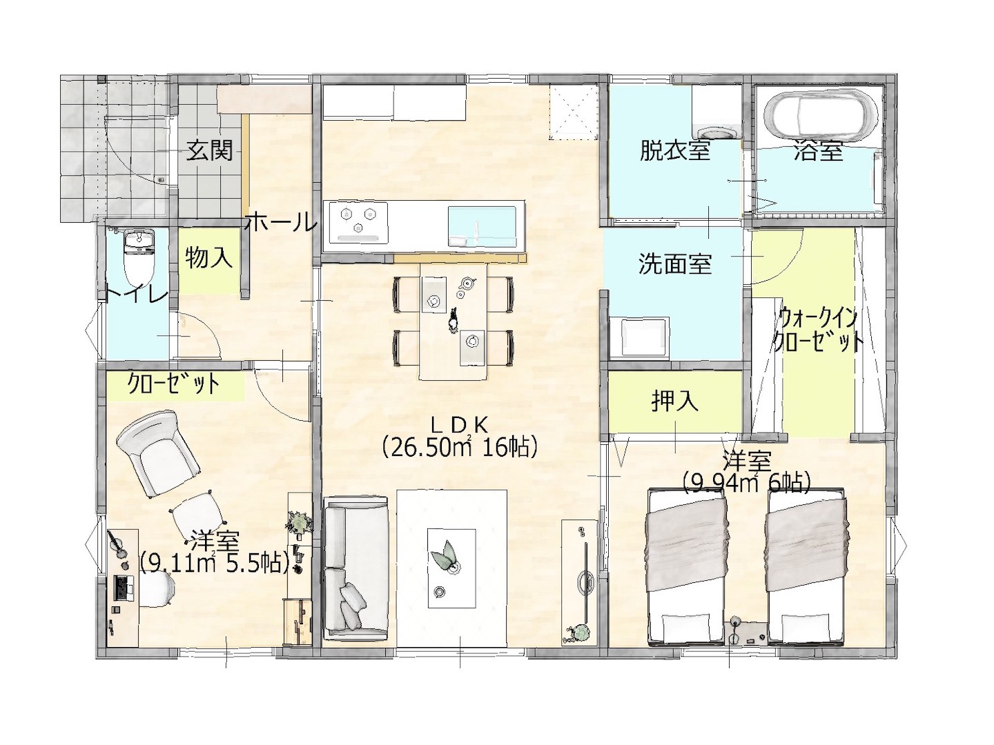 LDKを中心に各部屋へアクセスできる間取りにすることで、廊下をつくらない、または最小限に抑えることができます。