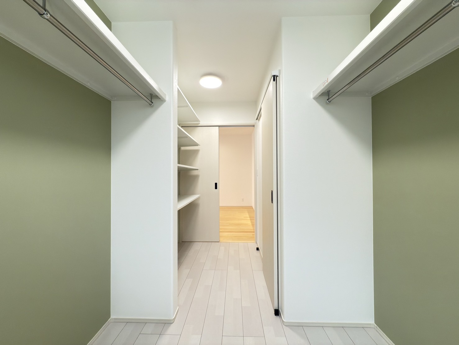 リビング→寝室→ウォークスルークローゼット→パントリー→キッチン→リビング、リビング→ファミリークローゼット→洗面脱衣室→キッチン→リビング、玄関→寝室→リビング→玄関と3つの回遊動線のある3LDK
